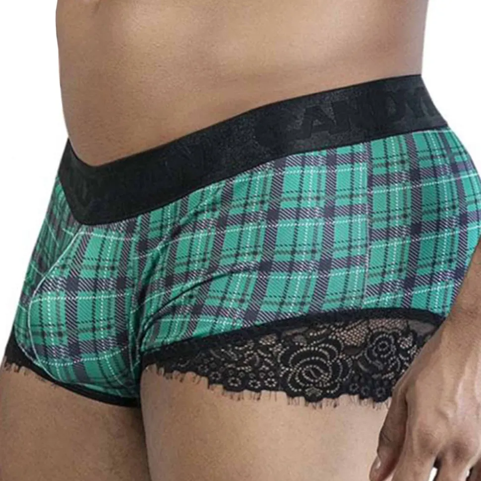 Shorty sexy en microfibre douce et extensible imprimée d’un motif tartan. Détails en dentelle sur les cuisses. Poche frontale non doublée. Ceinture élastique large.