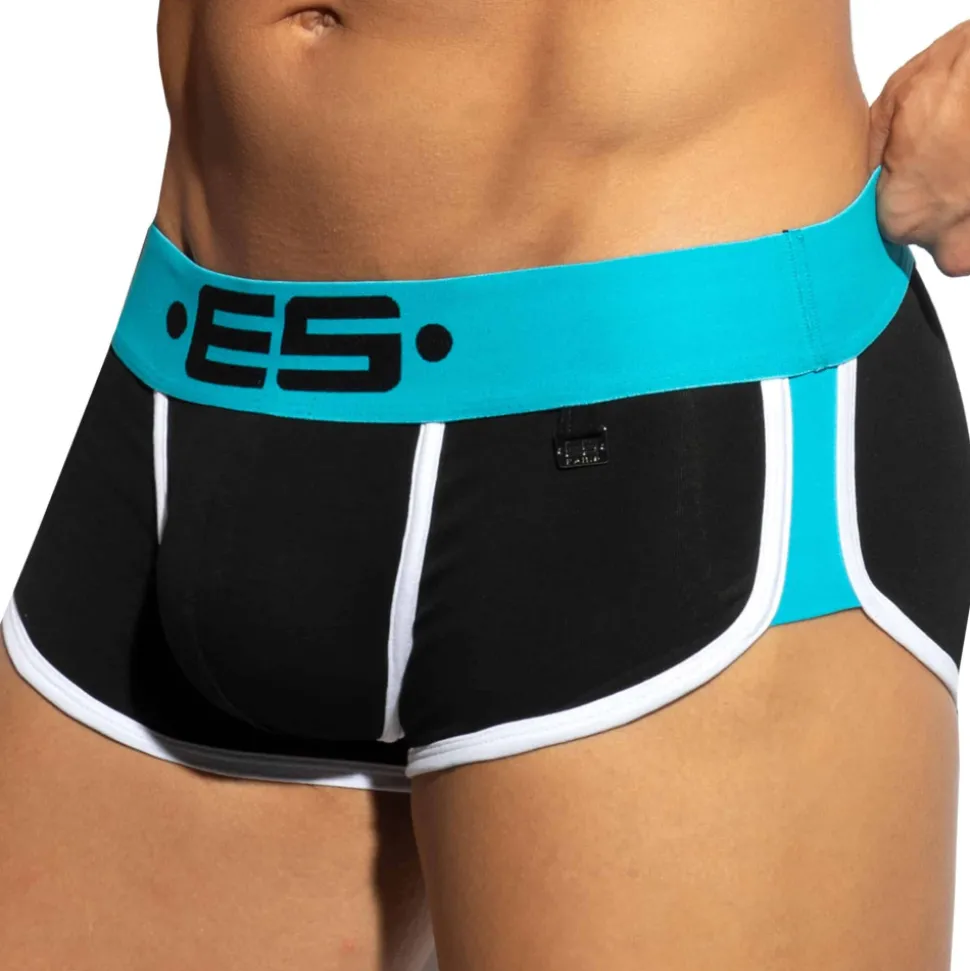 Shorty dont la coupe taille basse parfaitement ajustée a été conçue par Les Dessous d’Apollon. Poche frontale superbement découpée pour un très grand confort. L’échancrure sur le côté est soulignée par une bande de couleur contrastée. Large ceinture élastique signée ES Collection. Plaque métallique ES Paris en Zamak inoxydable.