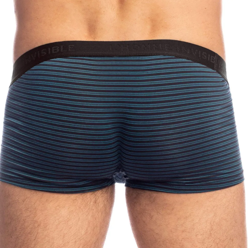 Shorty chic et élégant en micro-modal ultra soyeux, léger et confortable. Fines rayures bleu turquoise et noires qui mettent en valeur les formes du corps. Poche frontale ergonomique push up non doublée. Absence de couture à l’arrière et sur les côtés, pour un effet seconde peau. Ceinture élastique contrastée signée L’Homme Invisible.