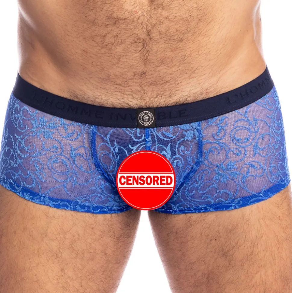 Shorty sensuel et raffiné en dentelle douce, légère et confortable. Tissu transparent orné d’un motif baroque bleu. Poche frontale ergonomique push up non doublée. Absence de couture à l’arrière et sur les côtés, pour un effet seconde peau. Ceinture élastique contrastée signée L’Homme Invisible.