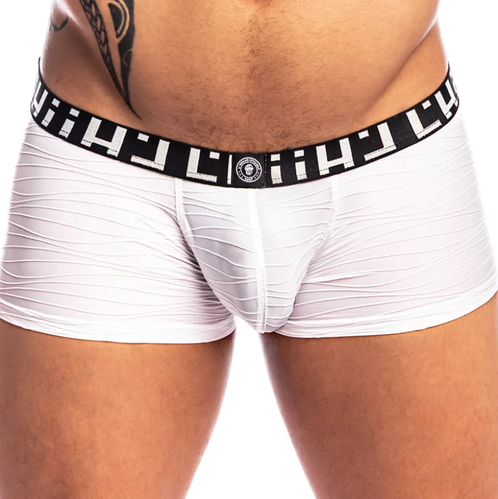 Shorty élégant en microfibre blanche plissée pour un effet structurant. Tissu doux et léger pour un confort seconde peau. Poche frontale ergonomique push up non doublée. Absence de couture à l’arrière et sur les côtés, pour un effet seconde peau. Ceinture élastique graphique signée L’Homme Invisible en lettres argentées.