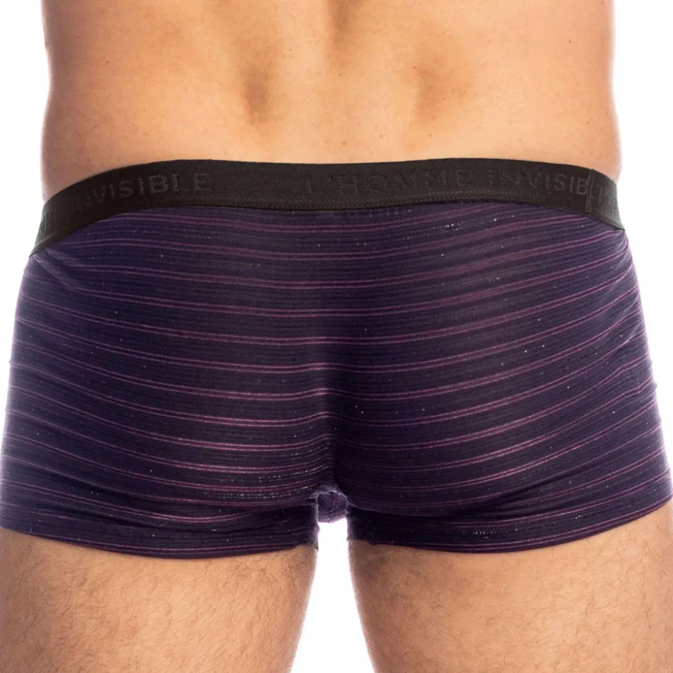 Shorty glamour et élégant en tissu ultra soyeux, léger et confortable. Fines rayures qui mettent en valeur les formes du corps. Fils métallisés Lurex pour un subtil effet pailleté. Poche frontale ergonomique push up non doublée. Absence de couture à l’arrière et sur les côtés, pour un effet seconde peau. Ceinture élastique contrastée signée L’Homme Invisible.