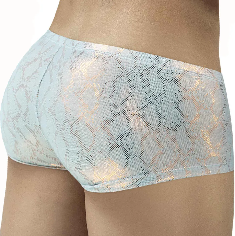 Shorty super taille basse en microfibre douce et extensible. Motif reptile brillant qui accroche subtilement la lumière. Poche ergonomique push-up non doublée, qui augmente le volume frontale sans ajout de mousse. Coupe originale très ajustée. Logo Clever cousu sur la fine ceinture élastique recouverte.