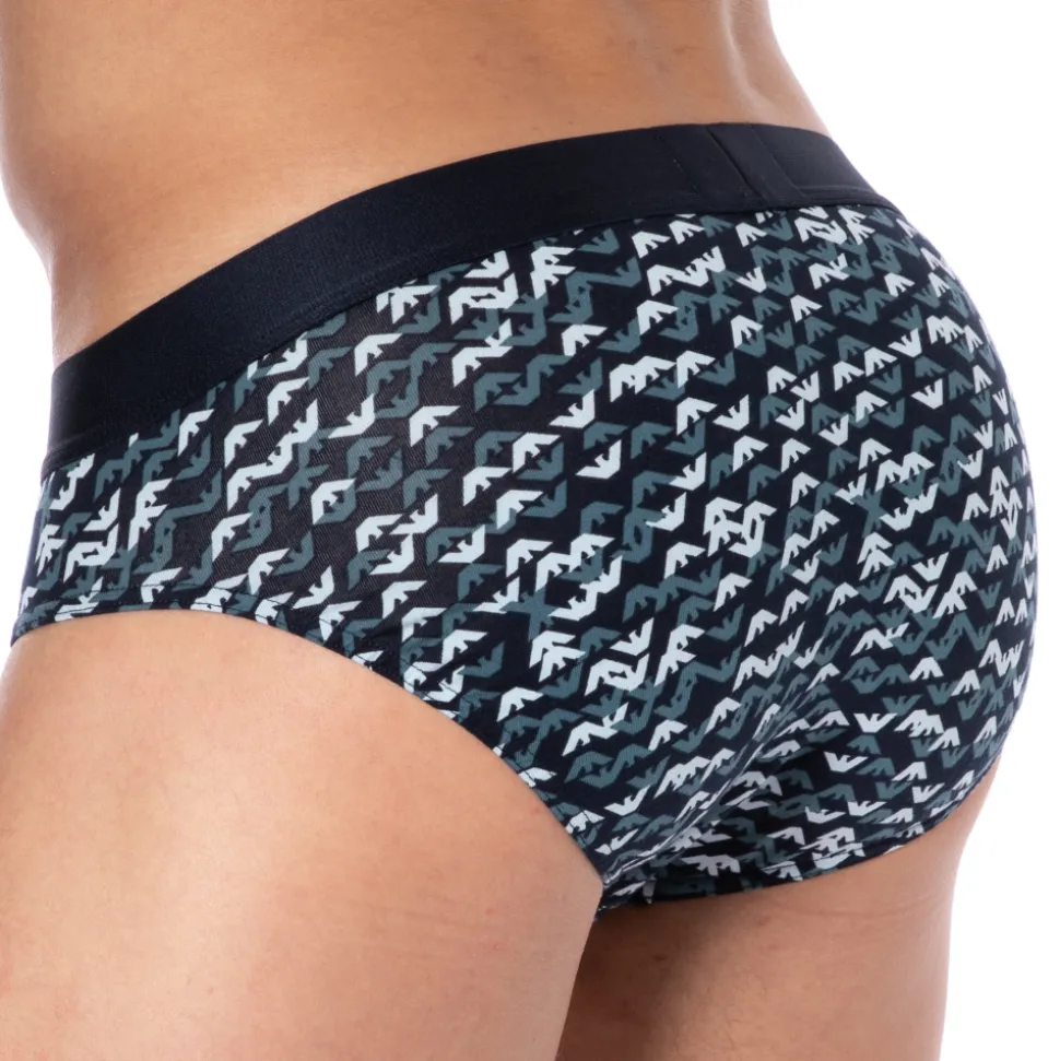 Slip en coton extensible très doux et confortable. Imprimé allover constitué d’aigles iconiques de la marque. Coupe taille basse, simple et élégante. Poche frontale doublée. Ceinture élastique signée Emporio Armani.