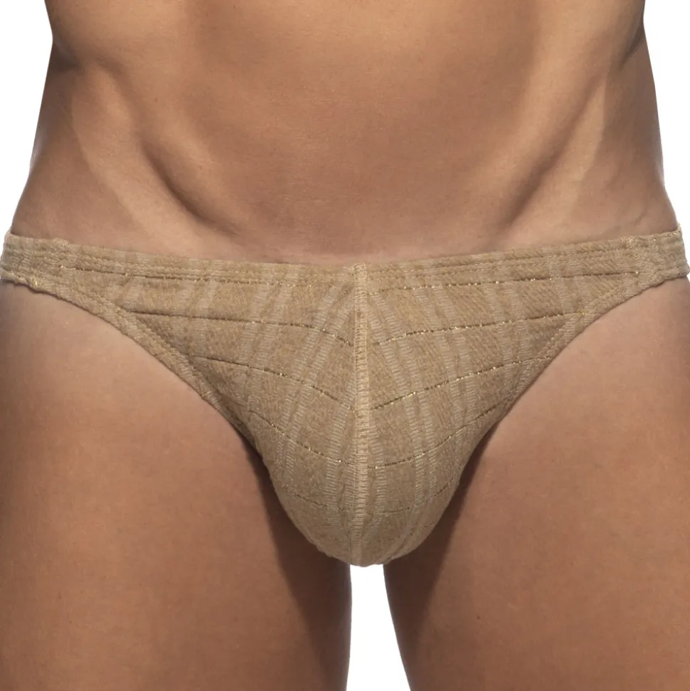 Slip luxueux et élégant en microfibre texturée ornée de fines rayures en fil métallisé doré. Poche frontale non doublée. Coupe minimaliste, taille basse et ajustée. Etiquette AD en silicone à l’arrière.