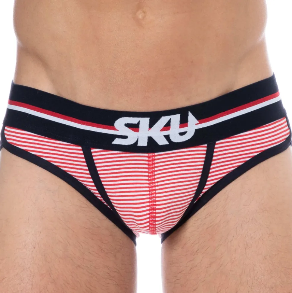 Slip sport et sexy en coton premium doux et extensible. Fine rayure horizontale. Coupe taille basse ajustée. Poche frontale préformée assurant un excellent maintien. Confort enveloppant sur les fesses. Belle échancrure sur le côté. Ceinture tricolore large et douce signée SKU. Bordures contrastées.