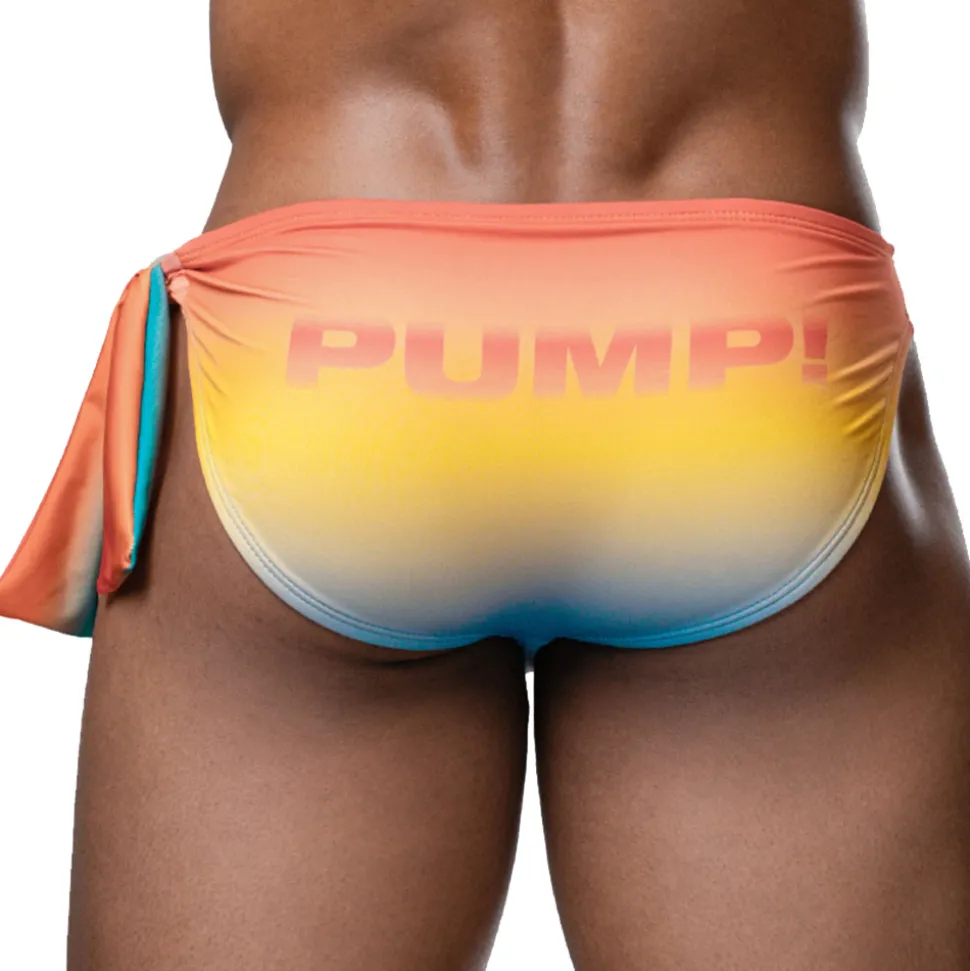 Slip de bain taille basse en microfibre extensible, douce et lisse. Design original avec nouage ajustable sur le côté gauche pour un maintien très confortable. Imprimé dégradé et grand logo PUMP! à l’arrière. Tissu de grande qualité avec protection solaire UPF 50+, haute résistance à la décoloration et séchage rapide. Entièrement doublé.