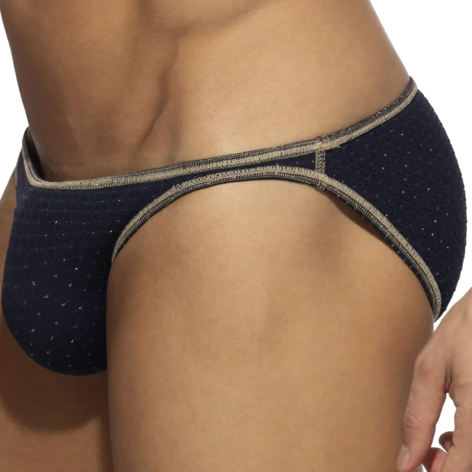 Slip de bain réversible en microfibre alliant élégance et confort. Grâce à la technologie U-Turn, il présente deux motifs distincts : de fines rayures dorées d’un côté et des pois dorés de l’autre. Poche frontale moulée sans couture pour un confort optimal. Coupe minimaliste, taille basse et ajustée. Etiquette AD en silicone à l’arrière.