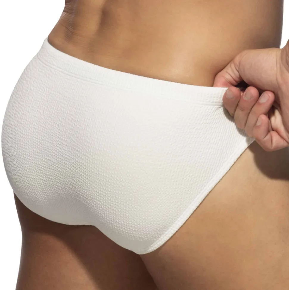 Slip de bain sexy en microfibre texturée luxueuse avec un effet froissé. Coupe taille basse et ajustée. Ceinture élastique avec cordon de serrage. Poche frontale moulée sans couture pour un confort optimal. Système Pack Up intégré avec mousse amovible pour mettre en valeur votre masculinité. Etiquette Addicted en silicone sur la hanche gauche.