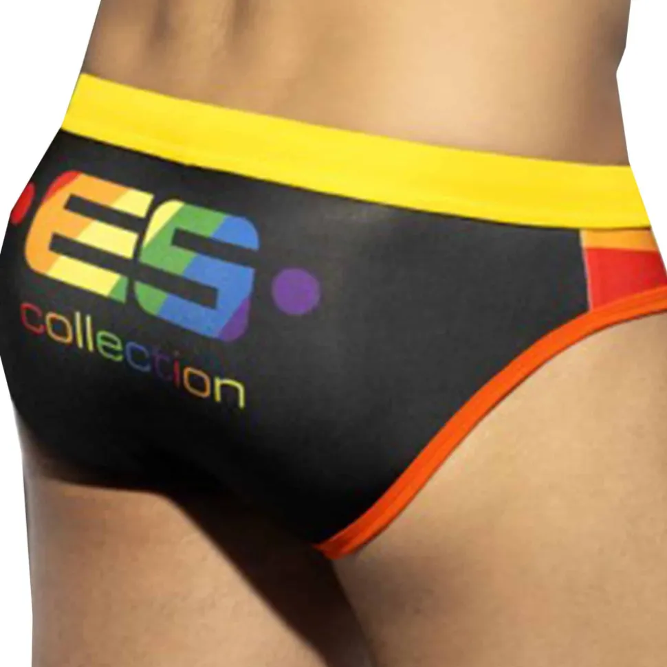 Slip de bain taille basse, sexy et ajusté aux couleurs de l’arc-en-ciel. Gros logo ES imprimé sur les fesses. Système Pack Up avec mousse amovible pour mettre en avant votre masculinité. Ceinture élatique avec cordon de serrage.
