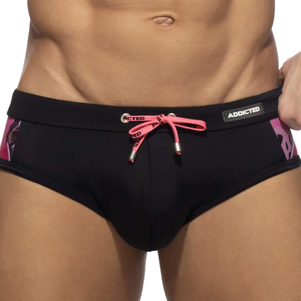Slip de bain sexy en microfibre extensible, légère et respirante. Coupe taille basse et ajustée. Imprimé coloré sur les côtés. Ceinture élastique avec cordon de serrage. Système Pack Up intégré avec mousse amovible pour mettre en valeur votre masculinité. Etiquette logo AD en silicone sur la hanche gauche.
