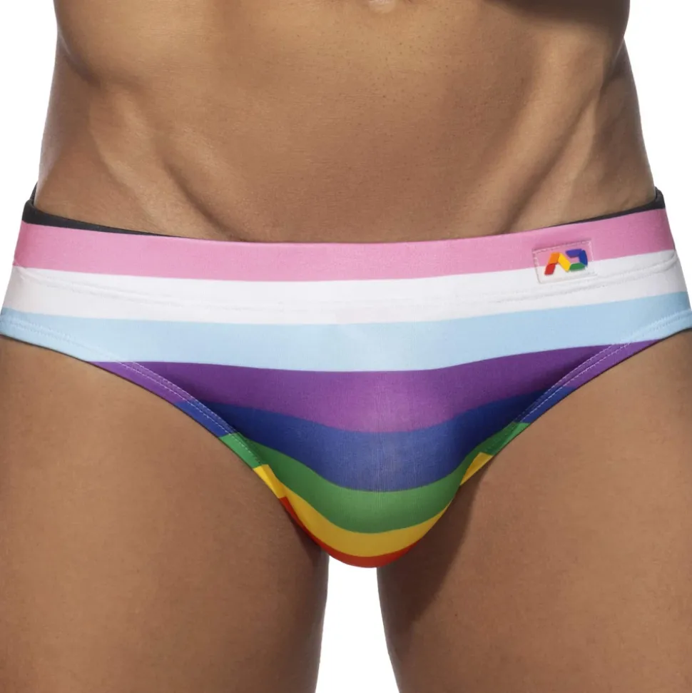 Slip de bain taille basse en microfibre séchant rapidement. Motif à rayures arc-en-ciel. Gros logo AD imprimé sur les fesses. Système Pack Up intégré avec mousse amovible pour plus de volume frontal. Poche frontale moulée sans couture pour un confort optimal. Ceinture élastique avec cordon de serrage intérieur. Logo Addicted en silicone sur la hanche gauche.