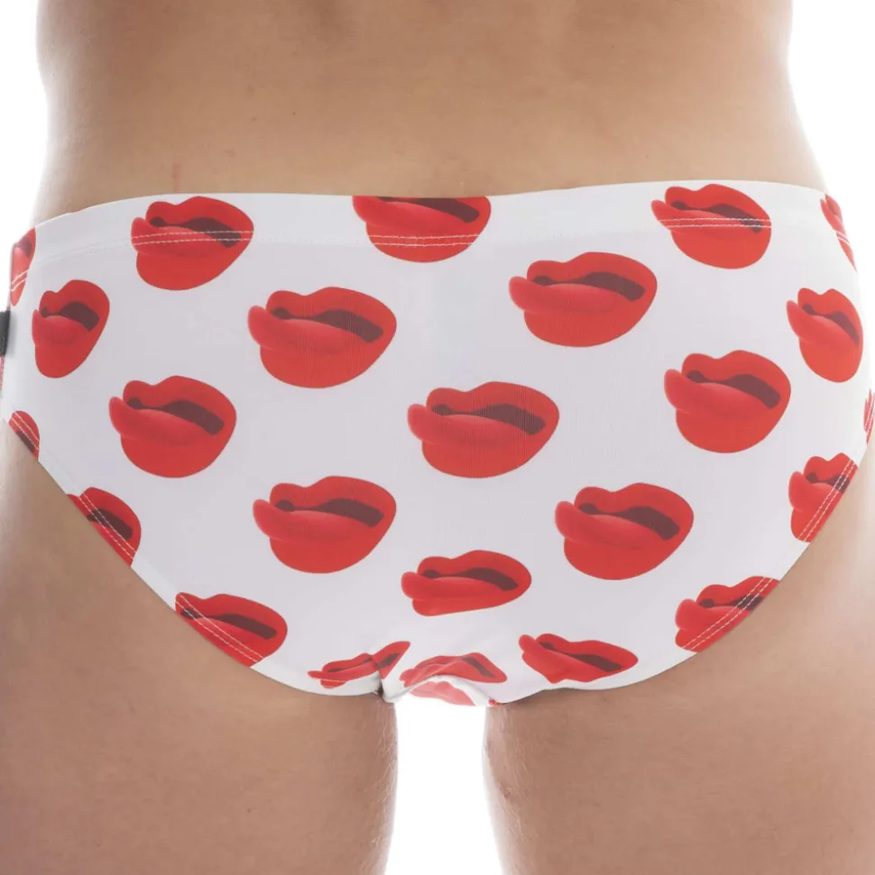 Slip de bain taille basse – original et provocant – en microfibre extensible séchant rapidement. Coupe classique ajustée. Poche frontale doublée. Motif bouches sur fond uni. Fine ceinture élastique recouverte avec cordon de serrage intérieur.