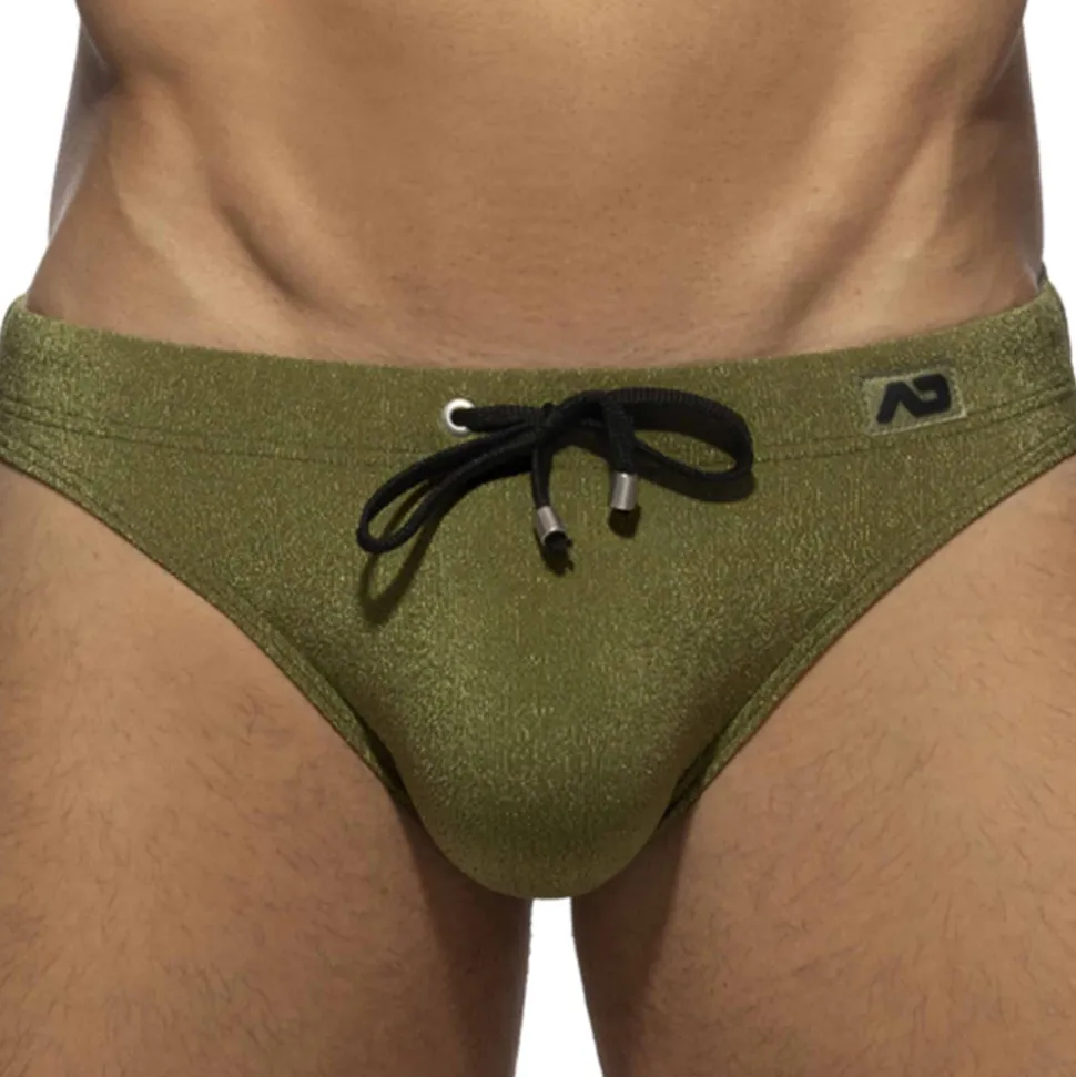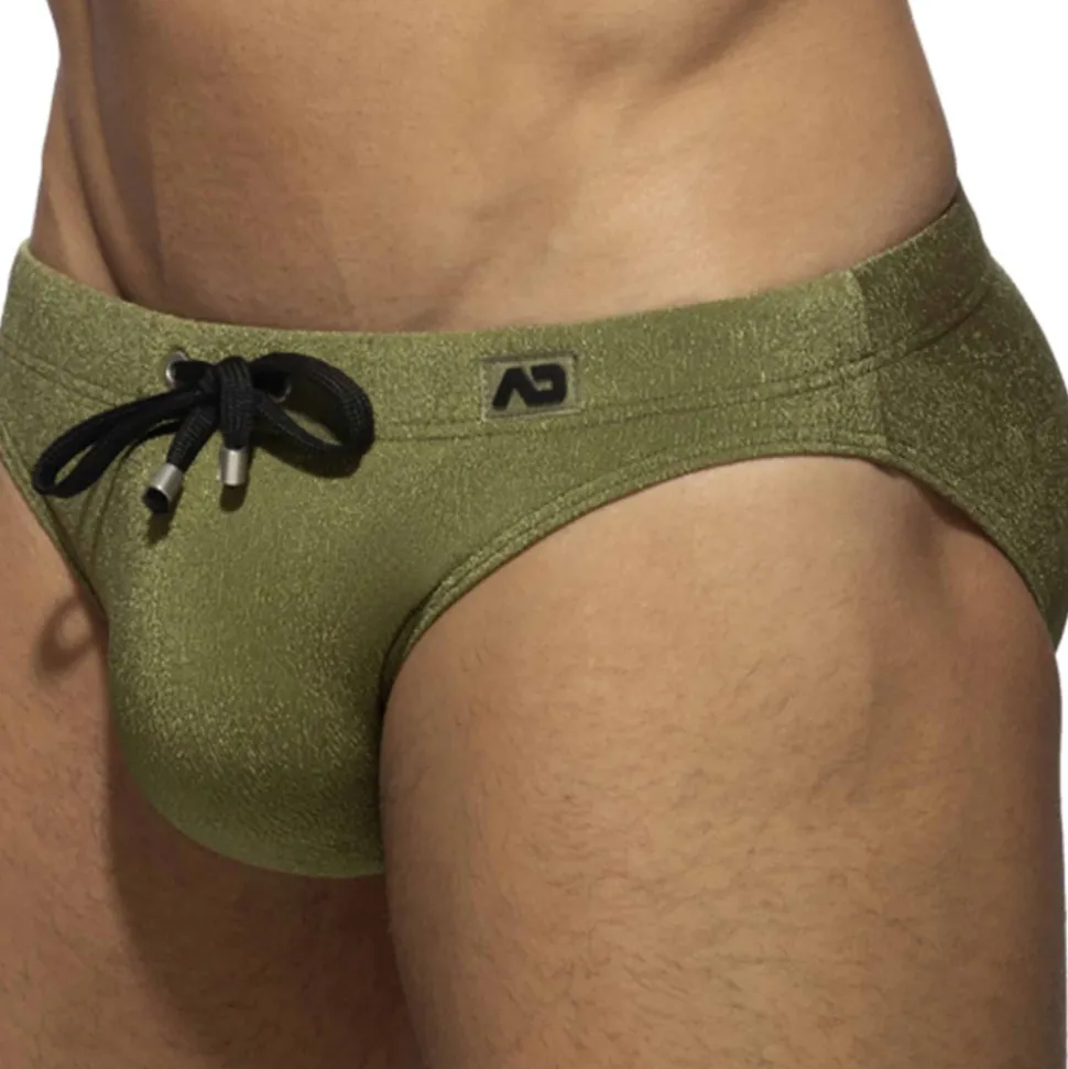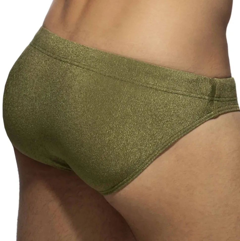 Slip de bain bikini taille basse en microfibre texturée légèrement brillante. Système Pack Up intégré avec mousse amovible pour plus de volume frontal. Poche frontale moulée sans couture pour un confort optimal. Ceinture élastique avec cordon de serrage de couleur contrastée. Logo Addicted en silicone sur la hanche gauche.