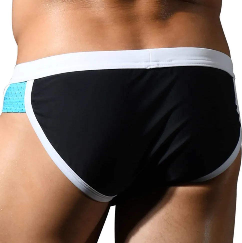 Slip de bain en microfibre séchant rapidement. Tissu extensible dans 4 directions. Coupe taille basse très ajustée. Empiècements en mesh de couleur contrastée sur les côtés. Poche frontale ergonomique non doublée. Plaque métallique signée Andrew Christian. Ceinture élastique avec cordon de serrage. Edition limitée.