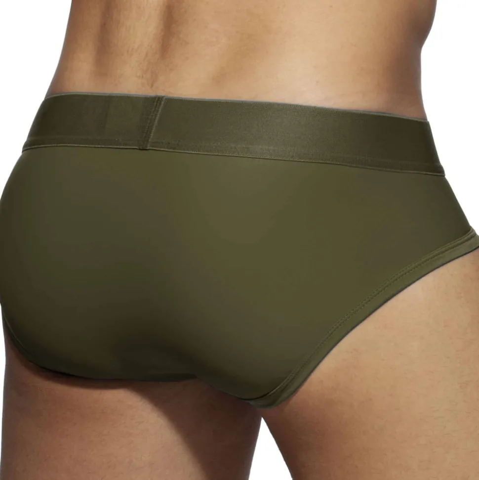 Slip en microfibre ultra douce et agréable à porter de couleur fétichiste. Coupe taille basse très ajustée, idéale pour mettre en valeur vos formes. Ceinture élastique avec logo AD en silicone.