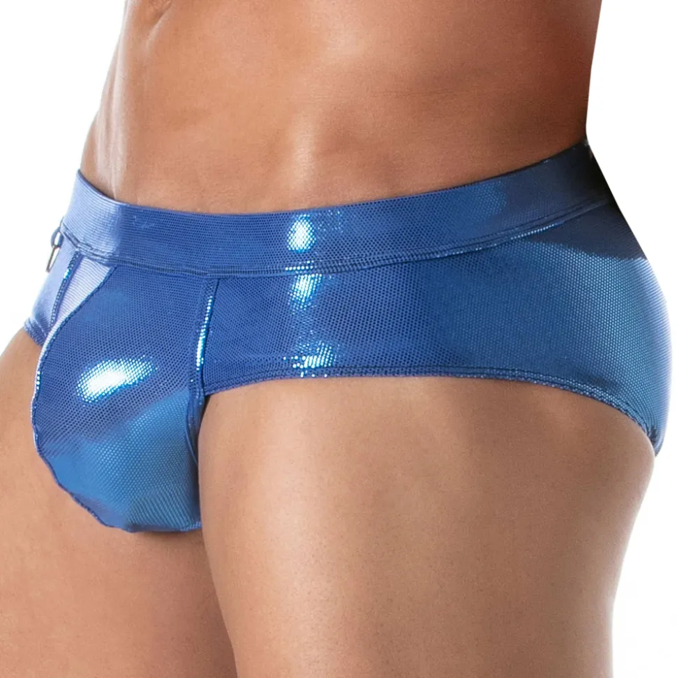 Slip en microfibre métallisée brillante, qui reflète la lumière comme une boule à facette. Poche frontale non doublée. Ceinture élastique recouverte avec plaque métallique signée TOF Paris.