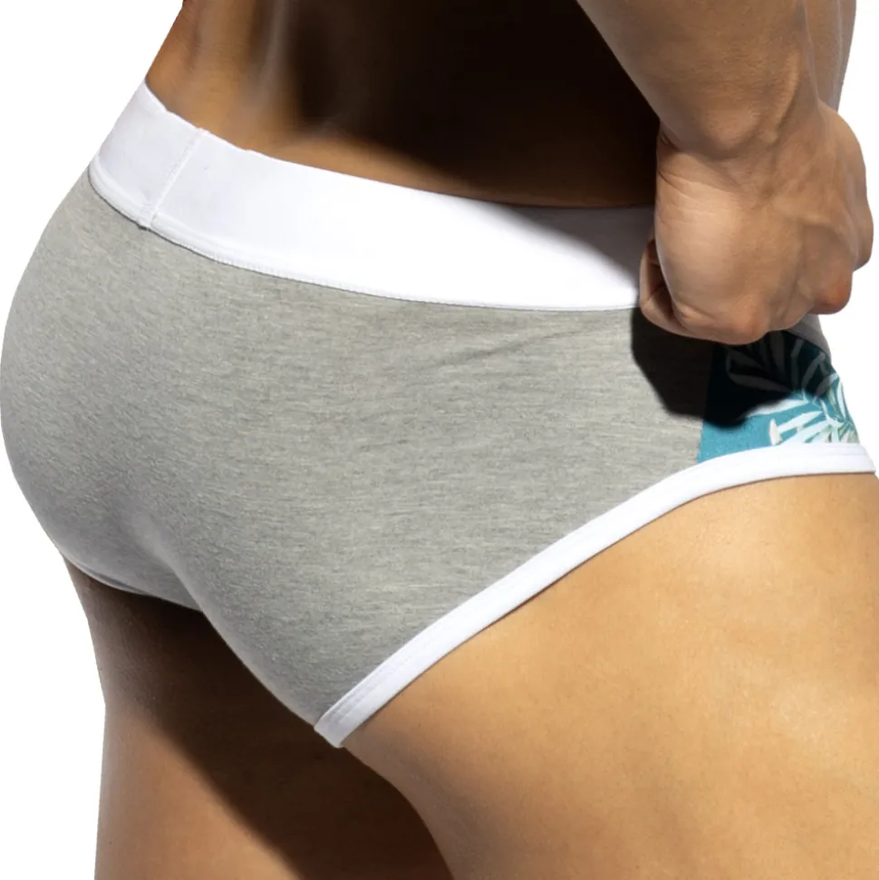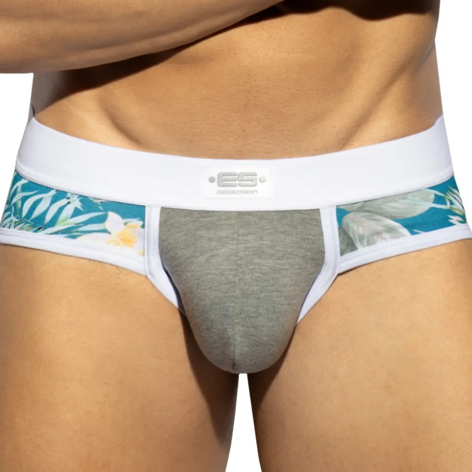 Slip original en coton doux et confortable. Coupe taille basse et ajustée. Motif floral sur les côtés. Bordures de couleur contrastée. Grande poche frontale préformée. Logo ES Collection en silicone sur la ceinture élastique. Edition limitée.
