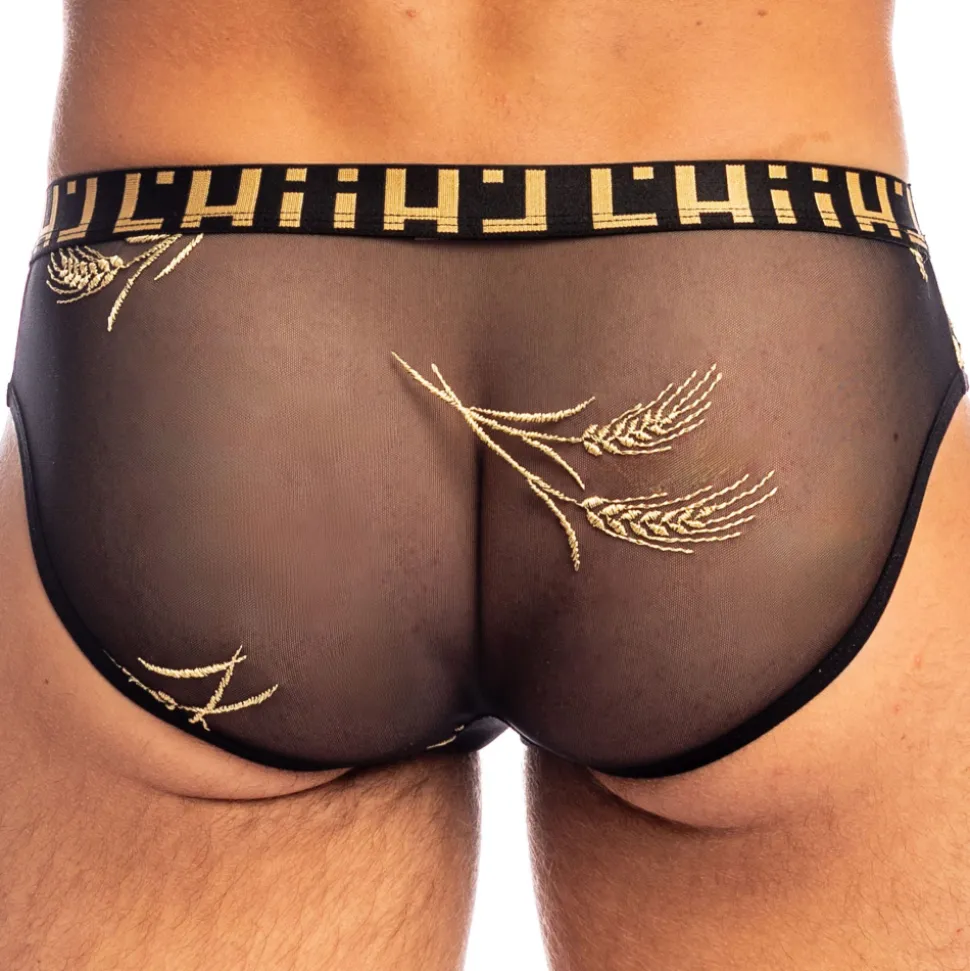 Slip sexy et raffiné en tulle transparent, ultra léger et confortable.Tissu brodé d’épis de blé dorés. Coupe taille basse ajustée. Poche frontale non doublée sans couture. Ceinture élastique signée L’Homme Invisible. Chaque pièce est unique, le positionnement de la broderie variant selon la coupe du tissu.