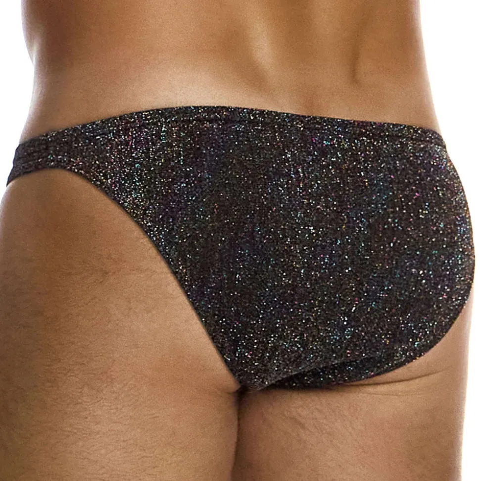 Slip glamour en microfibre tricotée avec des fils métallisés présentant des reflets multicolores. Coupe taille basse minimaliste. Poche frontale non doublée. Etiquette Modus Vivendi argentée cousue sur la hanche gauche.