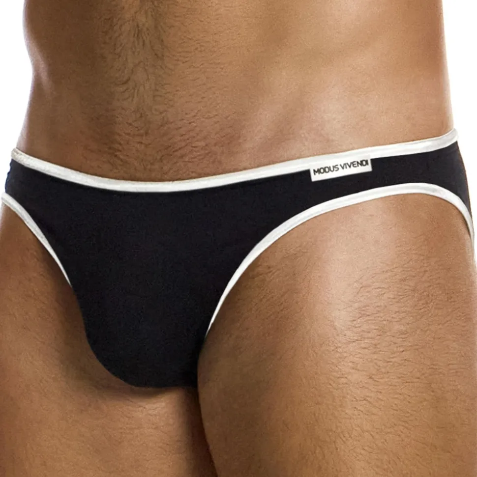 Slip luxueux, élégant et confortable en mélange très doux de soie et de viscose. Coupe taille basse. Poche frontale non doublée. Bordures satinées de couleur contrastée. Etiquette Modus Vivendi en silicone cousue sur la fine ceinture élastique.