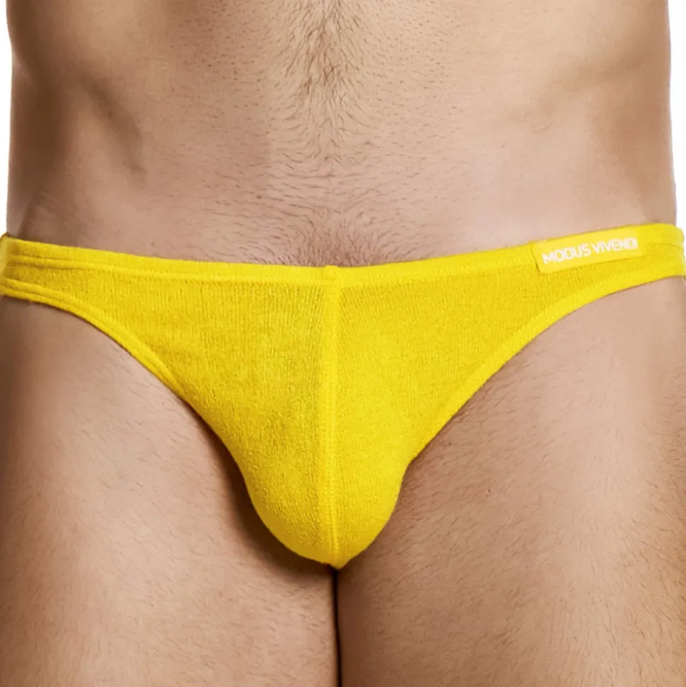 Slip taille basse minimaliste très sexy en tissu bouclette tricoté. Poche frontale non doublée. Etiquette Modus Vivendi sur la fine ceinture élastique recouverte.