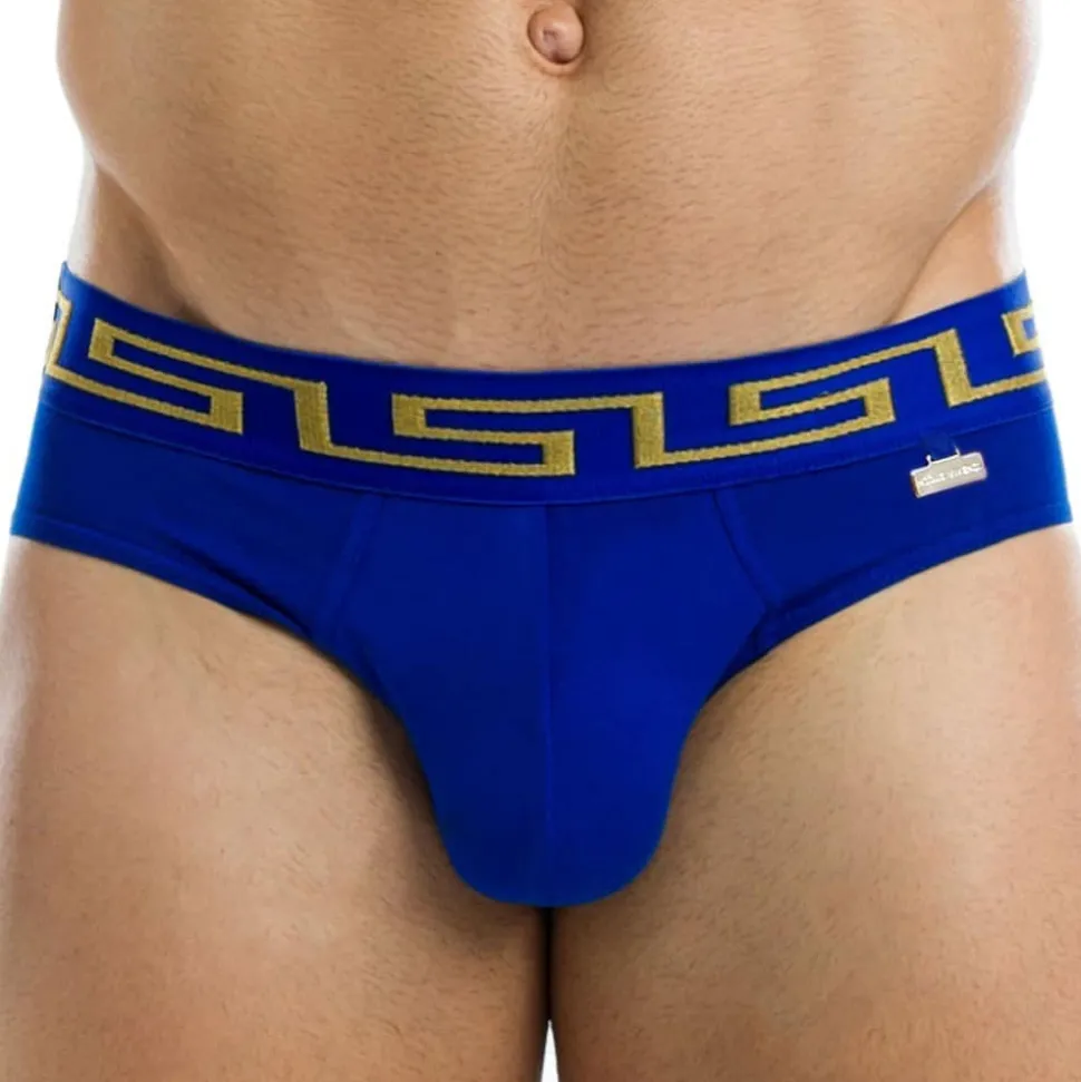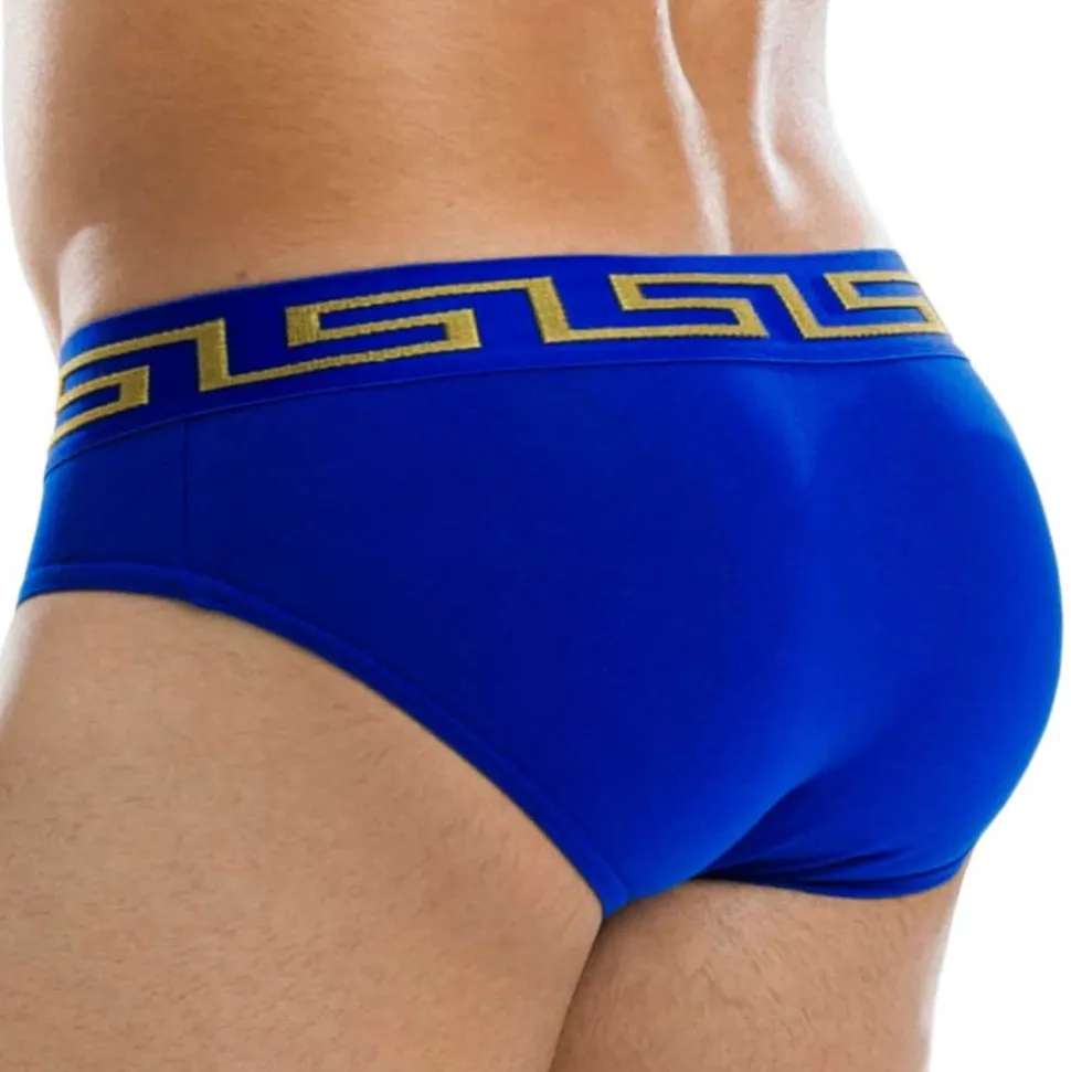 Slip taille basse en coton doux. Poche frontale doublée pour plus de confort. Plaque métallique Modus Vivendi sur la hanche gauche. Motif inspiré par la Grèce antique sur la ceinture élastique.
