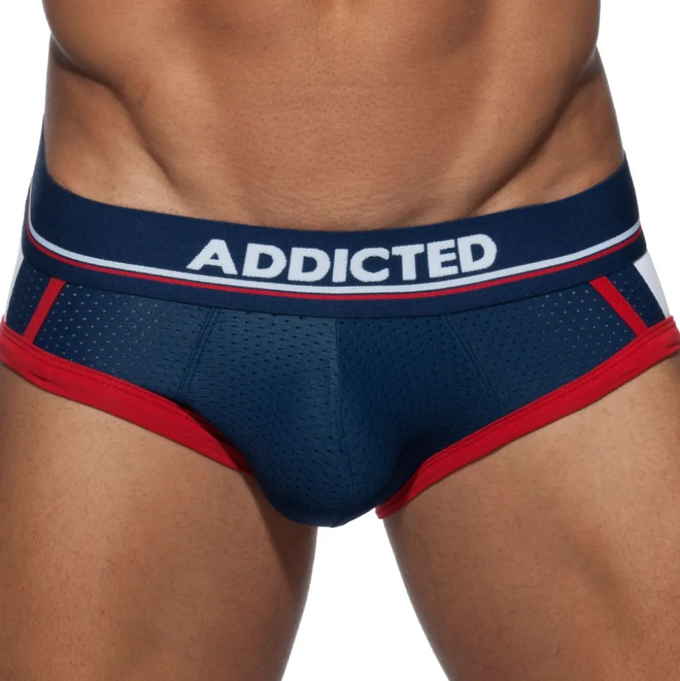 Slip taille basse très ajusté en mesh respirant, léger et confortable. Bandes sport sur les côtés. Bordures de couleur contrastée. Ceinture élastique signée Addicted. Fabriqué à Barcelone.