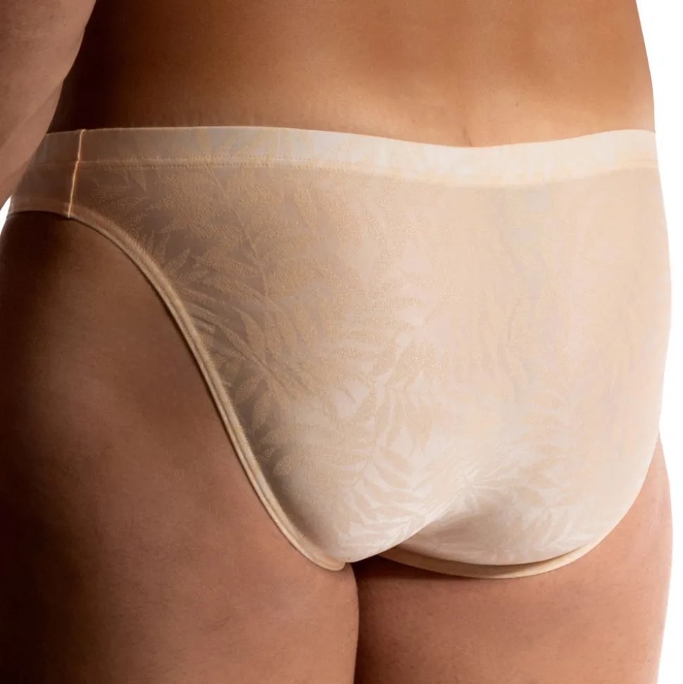 Slip sexy et élégant en microfibre extensible, transparente de couleur chair. Subtil motif floral ton-sur-ton. Coupe minimaliste très ajustée. Poche frontale non doublée. Etiquette Manstore cousue sur la fine ceinture élastique recouverte.