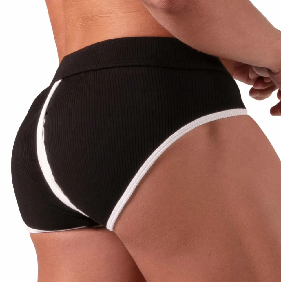 Slip provocant en coton côtelé très doux et confortable. Ouvertures pratiques permettant un accès rapide devant comme derrière. Détails de couleur contrastée. Ceinture élastique recouverte. Petite poche secrète. Fabrication française.