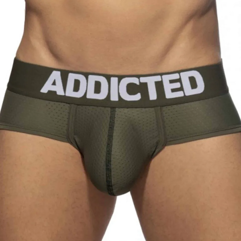 Slip de couleur unie en mesh respirant, léger et confortable. Poche frontale push up extra-large pour un excellent maintien et une valorisation naturelle de votre masculinité. Ceinture élastique signée Addicted.