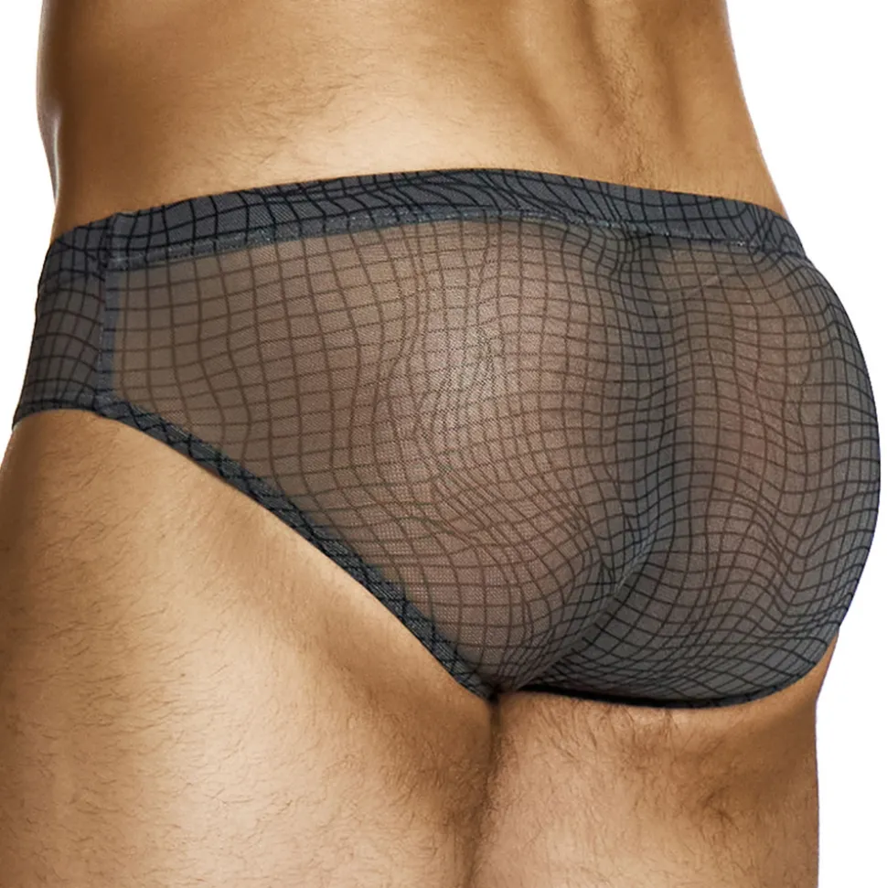 Slip sensuel en fine résille légèrement transparente et très douce, pour en effet seconde peau. Motif géométrique abstrait qui révèle subtilement le corps tout en mettant en valeur vos formes, pour un impact visuel maximal. Coupe minimaliste et ultra taille basse. Poche frontale non doublée. Etiquette Modus Vivendi en silicone cousue sur la fine ceinture élastique recouverte.