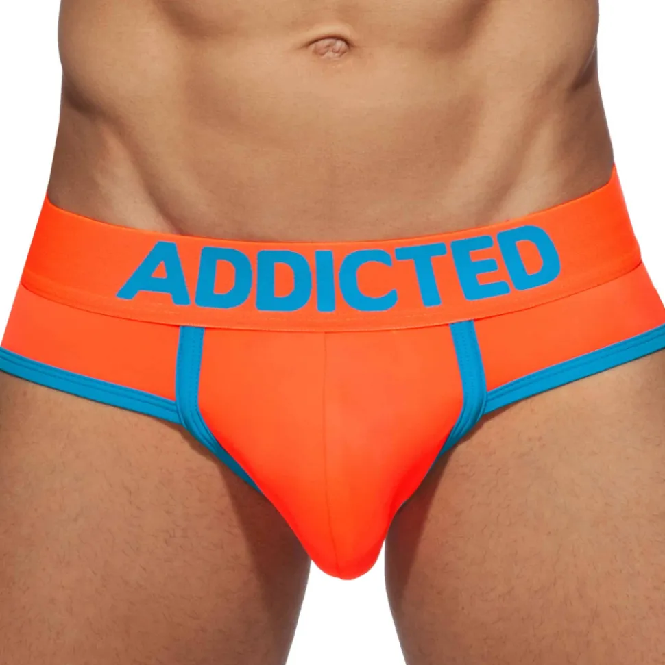 Slip 2 en 1 qui peut être porté en tant que sous-vêtement ou maillot de bain. Microfibre fluo à séchage rapide, ultra douce et résistante de couleur fluo. Matière et design innovants qui assurent un confort maximal sous un pantalon comme dans l’eau. Technologie RingUp intégrant un anneau cock ring en silicone (diamètre 5 cm, amovible par bouton pression) pour une érection plus dure et plus longue. Poche frontale push up pour mettre en avant votre masculinité, tout en assurant un maintien très confortable. Coupe taille basse très ajustée. Bordures de couleur contrastée. Ceinture élastique signée Addicted.