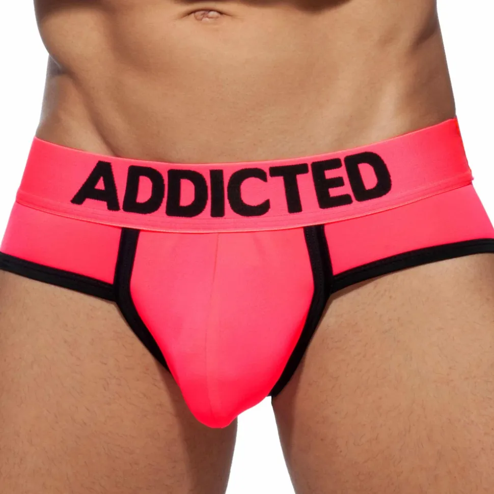 Slip 2 en 1 qui peut être porté en tant que sous-vêtement ou maillot de bain. Microfibre fluo à séchage rapide, ultra douce et résistante de couleur fluo. Matière et design innovants qui assurent un confort maximal sous un pantalon comme dans l’eau. Technologie RingUp intégrant un anneau cock ring en silicone (diamètre 5 cm, amovible par bouton pression) pour une érection plus dure et plus longue. Poche frontale push up pour mettre en avant votre masculinité, tout en assurant un maintien très confortable. Coupe taille basse très ajustée. Bordures de couleur contrastée. Ceinture élastique signée Addicted.