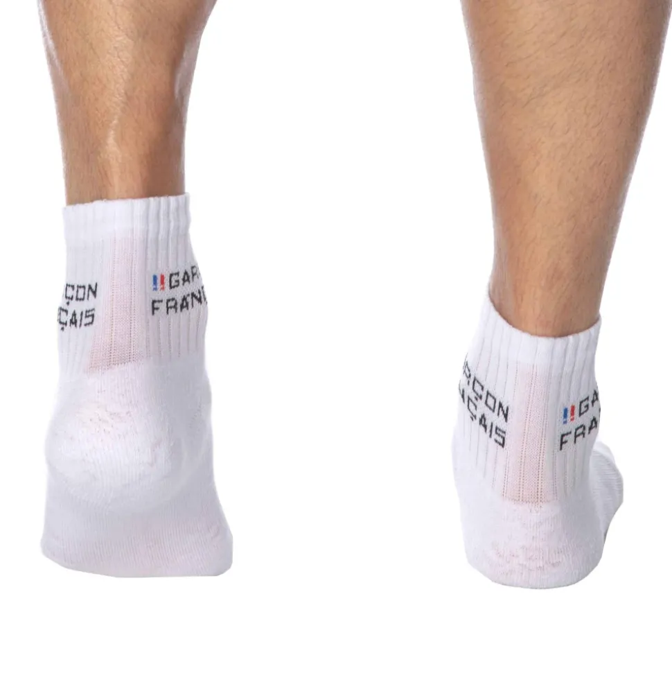 Socquettes en coton tricoté doux et confortable. Logo Garçon Français de chaque côté de la cheville. Semelle entièrement renforcée en finition bouclette. 2 tailles : 39-42 et 43-46. Fabrication 100% française.