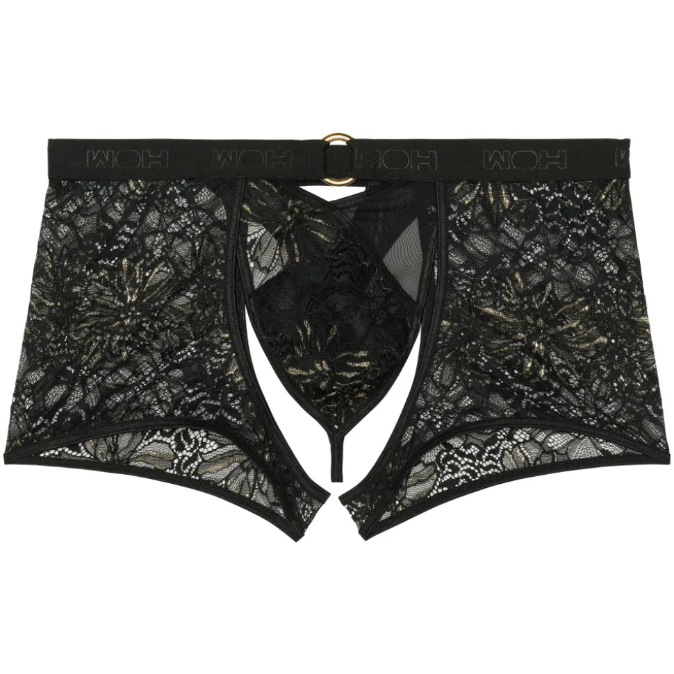 Sous-vêtement audacieux et élégant en dentelle noir et or et tulle transparent. Design provocant combinant un string et des chaps. Poche croisée dessinant une découpe provocante au-dessus du pubis. Telle un bijou, une boucle dorée décore la fine ceinture élastique signée WOH.