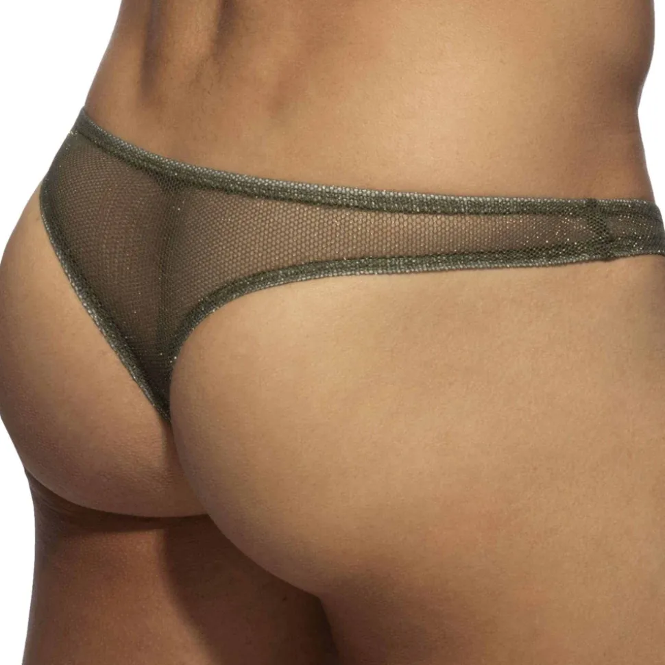 String sophistiqué et sexy en résille transparente ornée de fils métallisés dorés. Matière fine, légère et respirante. Coupe taille basse, minimaliste et très ajustée. Poche frontale moulée sans couture pour un confort optimal. Logo Addicted en silicone sur la fine ceinture élastique.