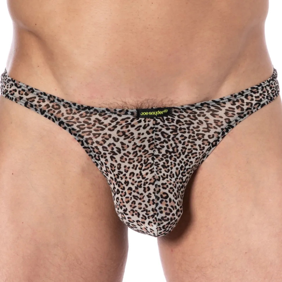 String classique très confortable avec sa large poche frontale. Imprimé léopard. En mélange de nylon et de lycra, ce sous-vêtement peut aussi faire office de maillot de bain pour les plus audacieux. Logo Joe Snyder. Fine ceinture élastique recouverte.