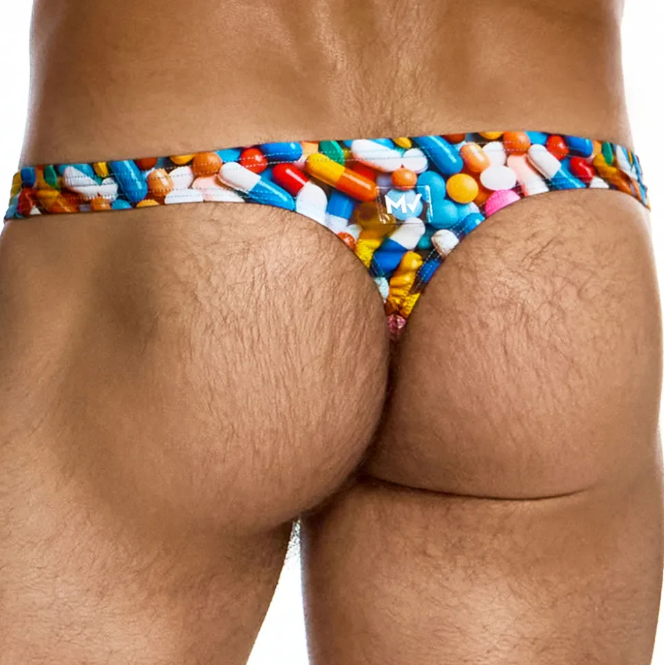 String de bain en microfibre extensible, séchant rapidement. Imprimé très coloré constitué d’une multitude de comprimés. Coupe sexy, minimaliste et taille basse. Poche frontale doublée. Logo MV en silicone à l’arrière.