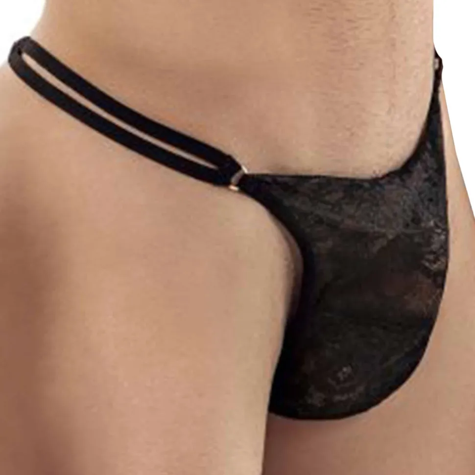 String taille basse, sexy et provocant, en dentelle transparente. Fines bandes élastiques attachées par de petits anneaux dorés sur les côtés.
