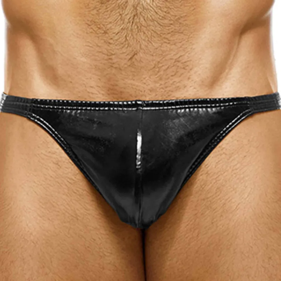 String ultra sexy en matière lisse et brillante imitant le latex. Plaque métallique avec logo découpé en haut des fesses. Poche frontale non doublée. Ceinture élastique fine.