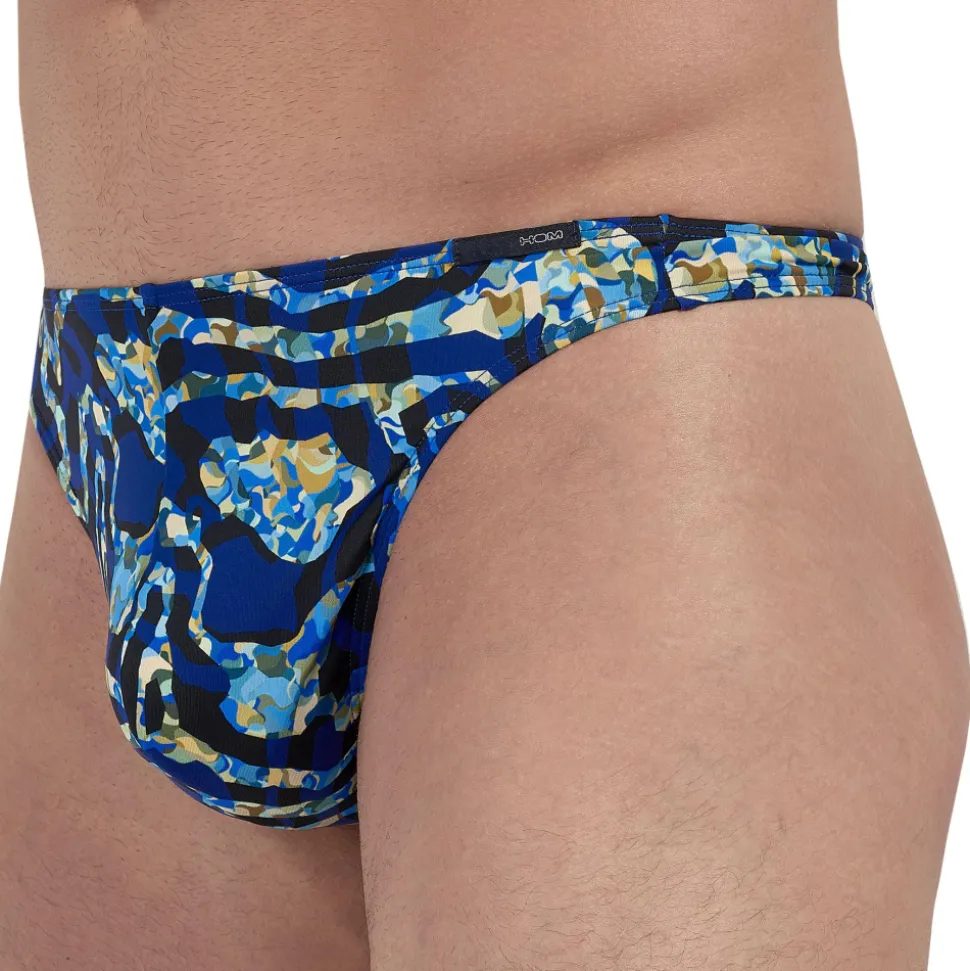 String sexy et original en microfibre extensible ultra douce et confortable. Imprimé abstrait aux formes irrégulières. Poche frontale doublée. Ceinture élastique fine avec étiquette HOM cousue sur la hanche gauche.