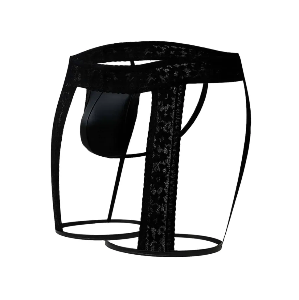 String très sexy en microfibre imitant le cuir. Jarrière intégrée en dentelle florale. Poche frontale non doublée.