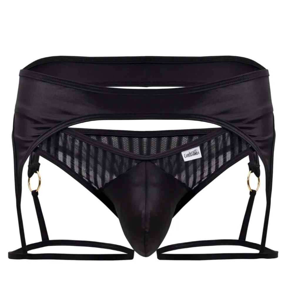 String très sexy en voile rayé semi-transparent. Jarretière en microfibre stretch avec fines bretelles et anneaux en métal. Poche frontale opaque, préformée et non doublée.