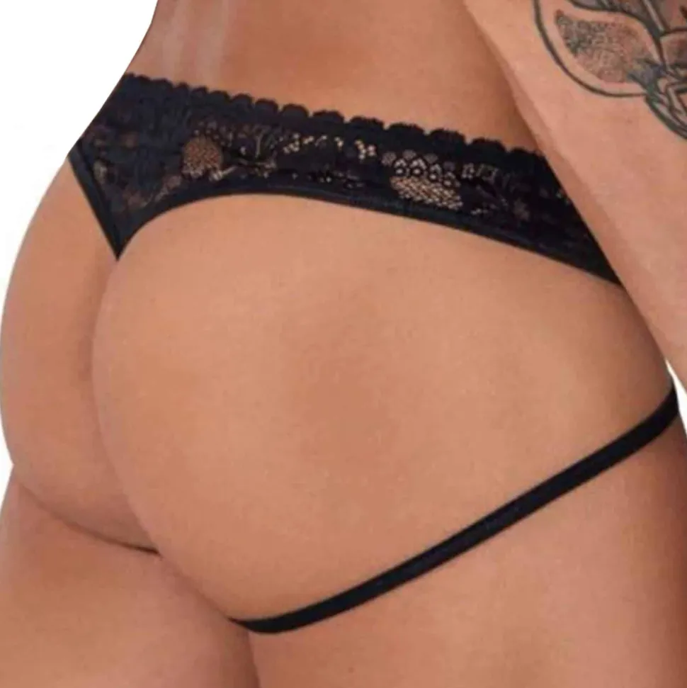 String taille basse sexy et provocant en dentelle transparente ornée d’un motif floral très sensuel. Design original doté de 2 straps élastiques façon jock sur les côtés, reliés par des anneaux métalliques dorés. Poche frontale en résille non doublée.