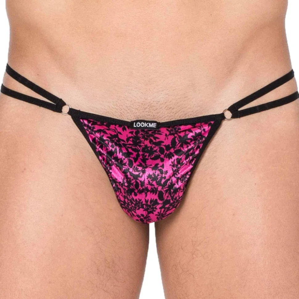String très sexy en microfibre extensible et confortable. Imprimé floral sur fond rose. Design minimaliste très ajusté. Double bande élastique de chaque côté tenue par de fins anneaux métalliques.