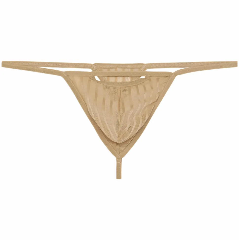 String ficelle, sexy et élégant, en résille fine et luxueuse. Alternance de rayures verticales opaques et transparentes. Poche frontale non doublée, surmontée d’une ouverture provocante.