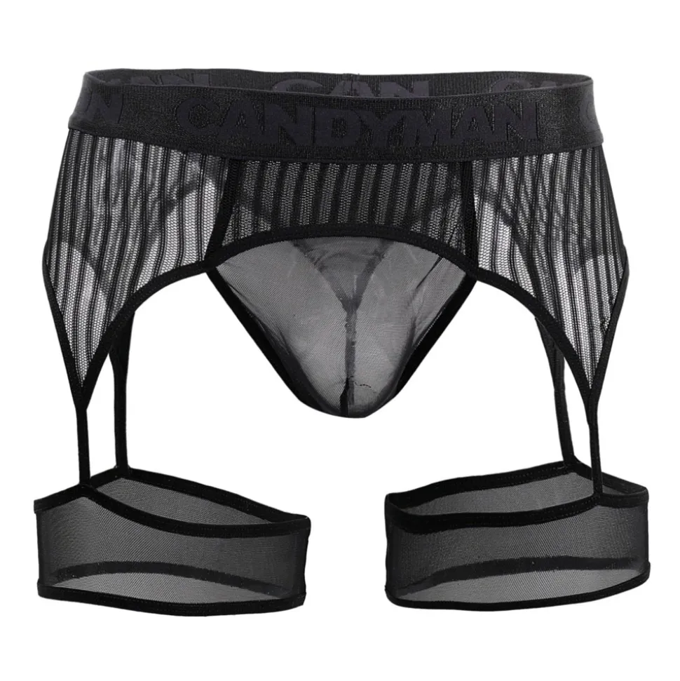 String très sexy en voile transparent combiné à un porte-jarretelle en résille rayée. Jarretières en tulle. Ceinture élastique signée Candyman ton-sur-ton.