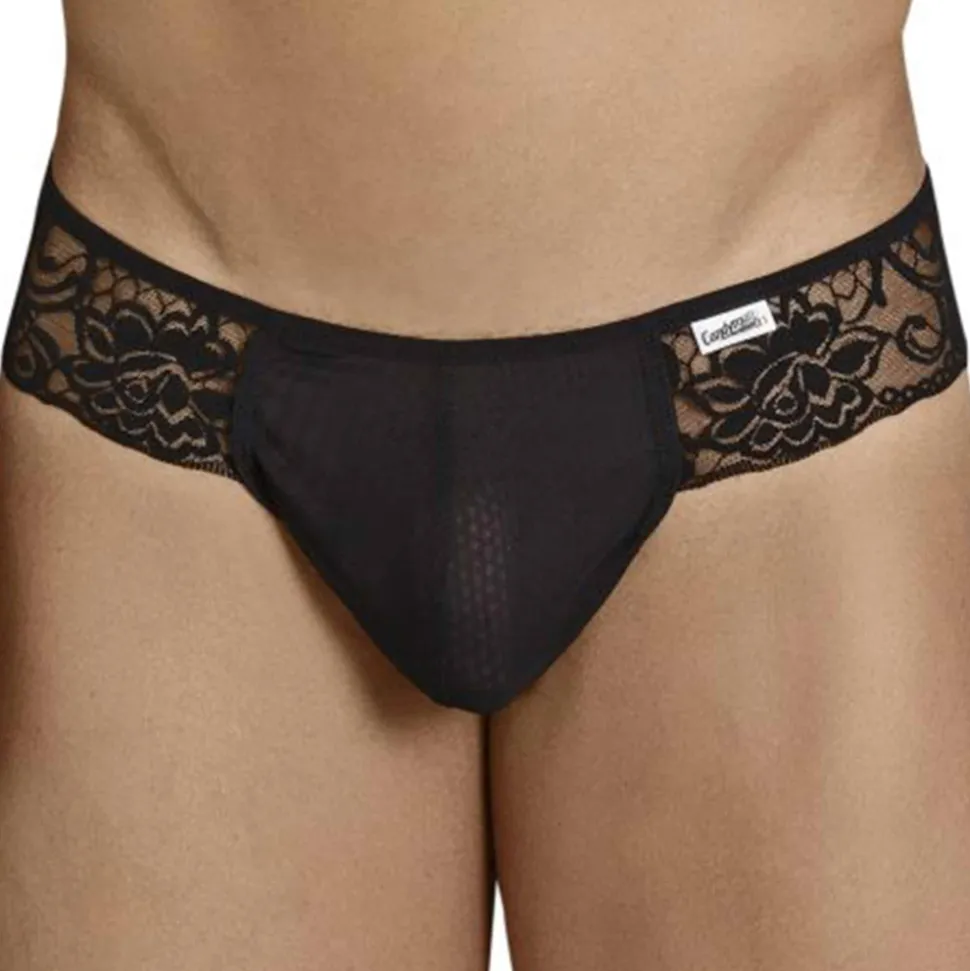 String très sexy en dentelle forale transparente. Poche frontale opaque non doublée en résille.