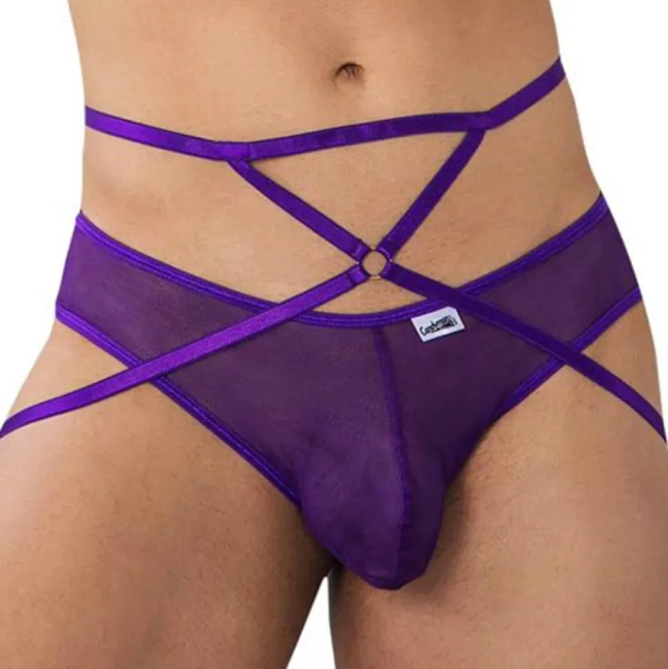 String très sexy en résille transparente. Fines bretelles autour de la taille et des fesses. Anneau métallique à l’avant et fermeture par crochet l’arrière.